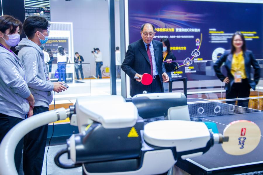 高通公司中国区董事长孟樸在展区与乒乓球机器人互动。受访者供图
